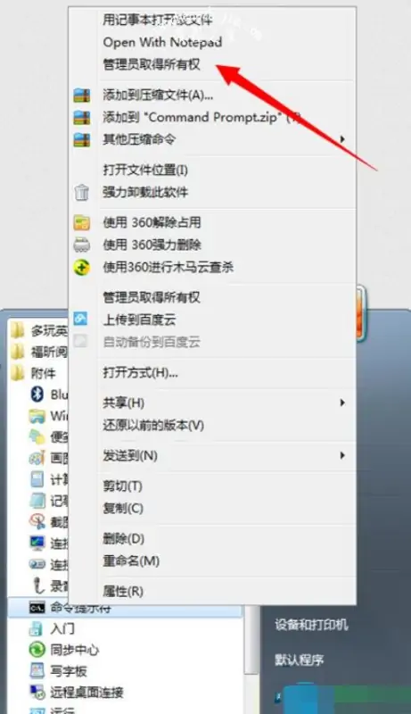 2、打開所有程序里的附件,右鍵命令提示符,點擊管理員取得所有權。