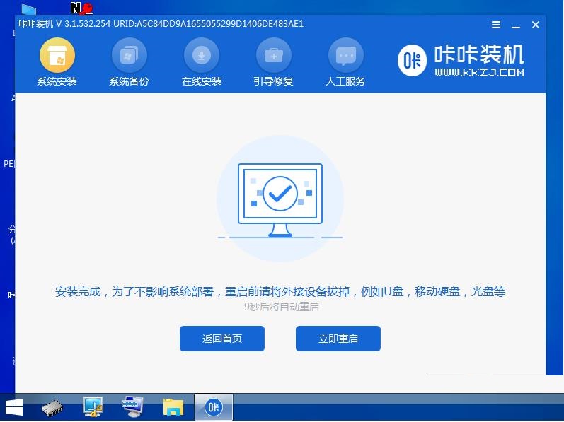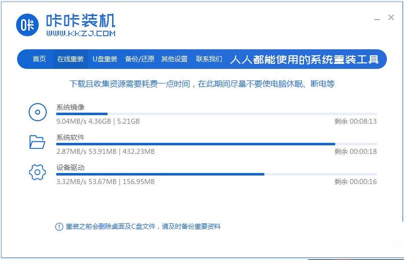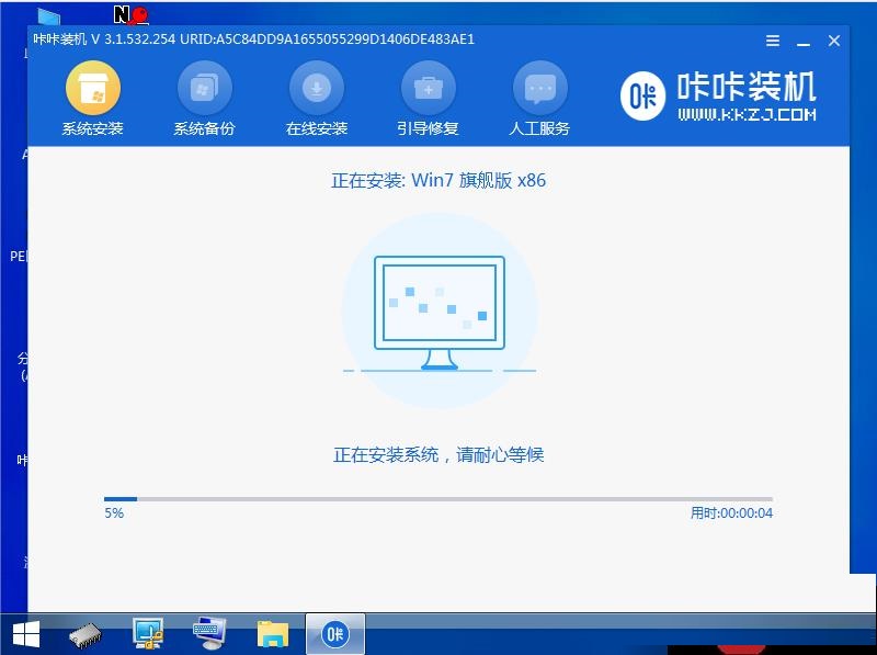 5、進入pe系統后,咔咔裝機工具自動開啟并安裝win7系統。
