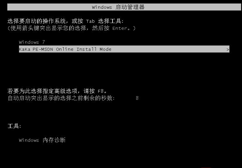 4、等待軟件進入到啟動管理界面,選擇kaka pe-msdn項進入pe系統內。