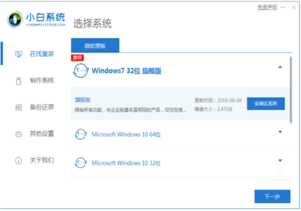 (1)首先在電腦上下載安裝小白一鍵重裝系統工具并打開,選擇我們需要安裝的win7原版系統,點擊安裝此系統,點擊下一步。