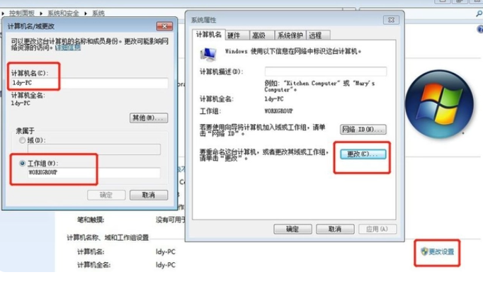 9、回到桌面右鍵計算機然后選擇屬性,在屬性界面點擊【更改設置】,在彈出來的計算機名選項卡里點擊【更改】選項。