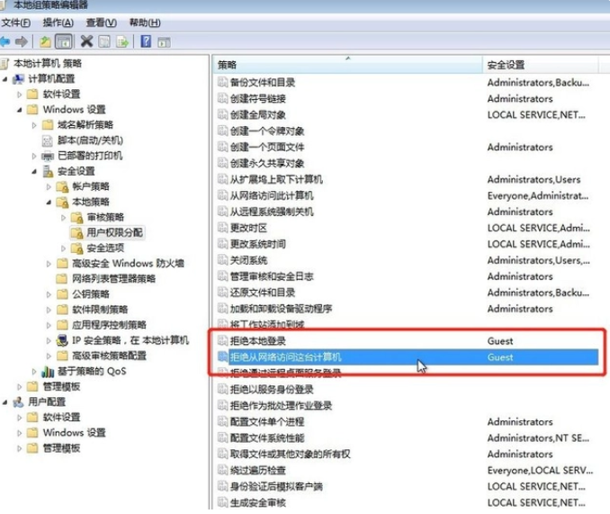 3、然后在彈出來的界面依次選擇,計算機配置、Windows 設置、安全設置、本地策略-、用戶權限分配,需要找到【拒絕本地登錄】和【拒絕從網絡訪問這臺計算機】的選項,雙擊進去把Guest刪除。