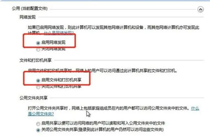 8、選中對應的網絡,剛剛我的網絡是公用網絡,那我就選公用網絡進行設置,【啟用網絡發現】、【啟用文件和打印機共享】、【關閉密碼保護共享】