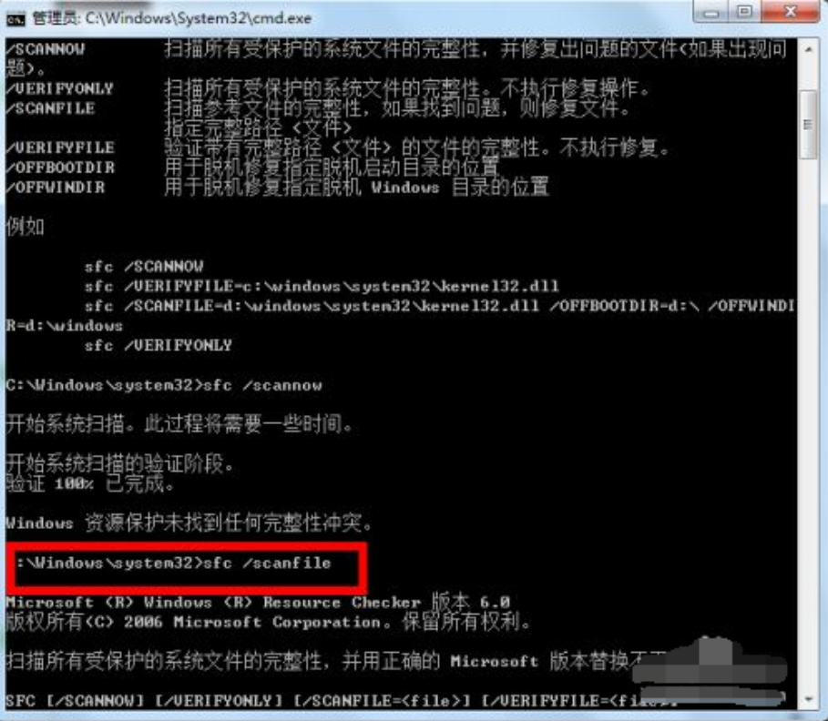 7、接著在命令框輸入sfc /scanfile回車,可以對系統的參考文件進行掃描和自動修復。