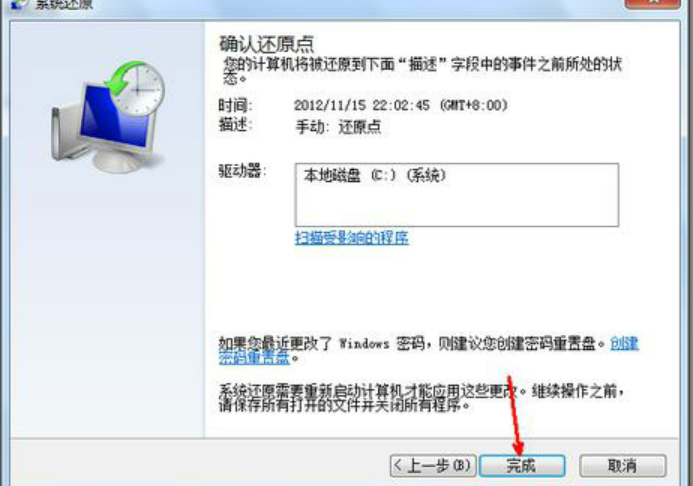6、確保信息沒有錯誤之后,點擊完成按鈕,開始系統的還原。