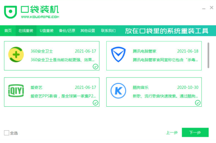 2、勾選直接需要在重裝系統后使用的應用軟件,,如果不需要則全不選,點擊下一步。