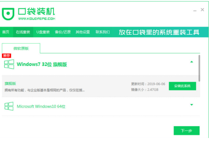 1、首先我們需要下載并且安裝一個口袋裝機工具,選擇我們要重裝的win7系統,點擊下一步。