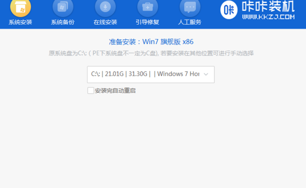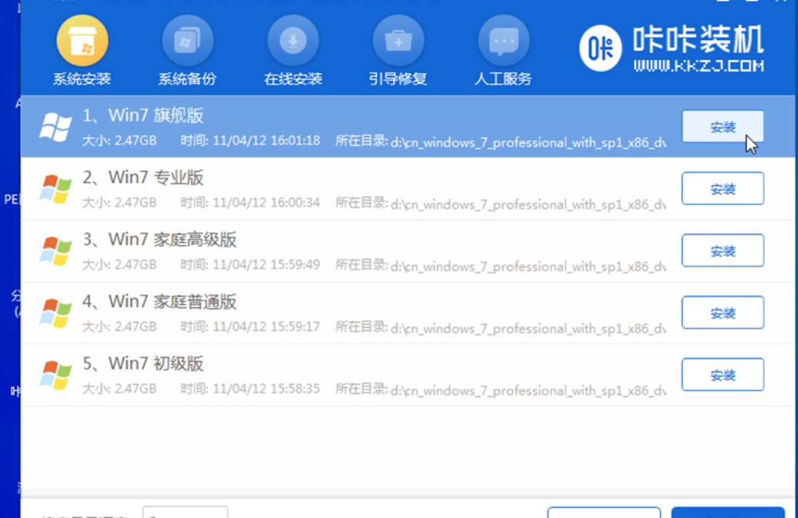 5、在pe系統桌面,打開咔咔裝機工具,然后選擇需要安裝的win7系統點擊安裝。