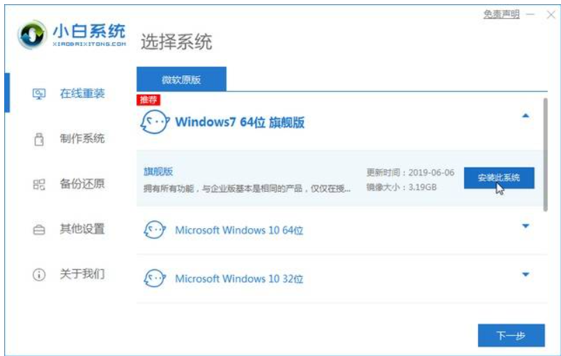 2、接著就進入了選擇系統的頁面,這里可以看到有各種版本的選項,點擊下載windows7系統,點擊下一步。