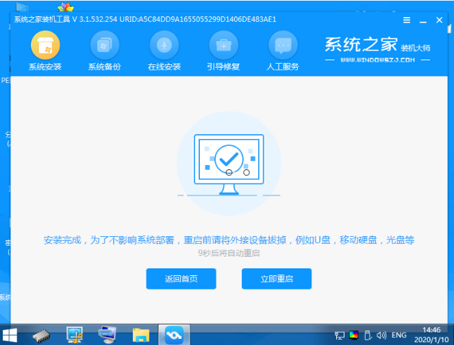4、進入該界面之后,耐心等待裝機工具繼續進行系統的安裝操作,成功安裝,我們需要再次點擊立即重啟該電腦。