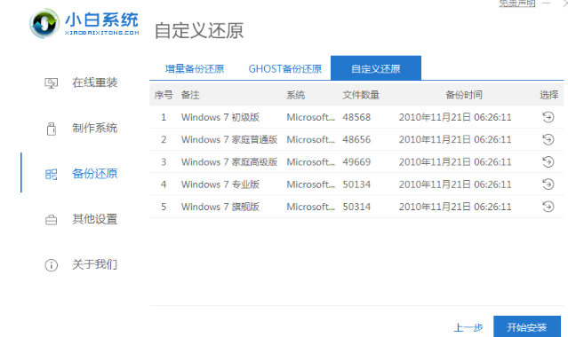下載并點開小白系統軟件,點一下備份還原——自定義還原,小白會自行識別出我們下載的深度win7 旗艦版系統文件,識別出來后點一下下一步。