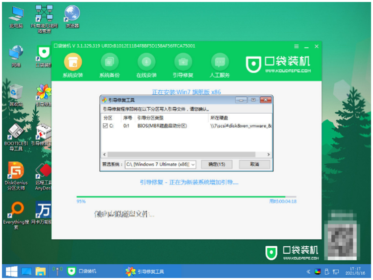 3、進入PE系統后,軟件將會自動安裝win7系統,完成后重啟電腦;