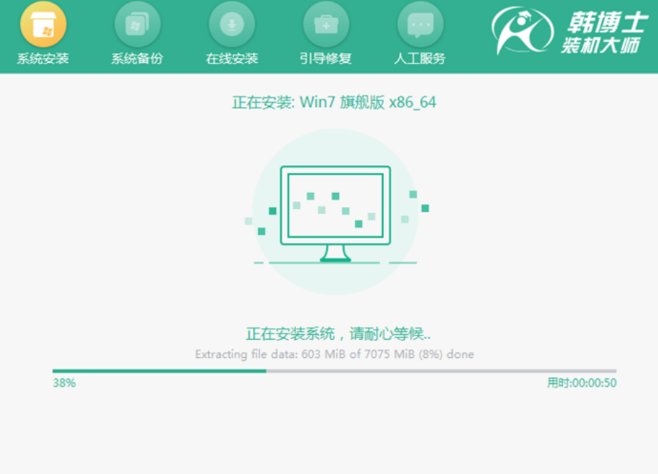 3、根據自身需要選擇系統文件的安裝位置,隨后“開始安裝”系統。韓博士進入安裝系統狀態,耐心等待安裝完成。