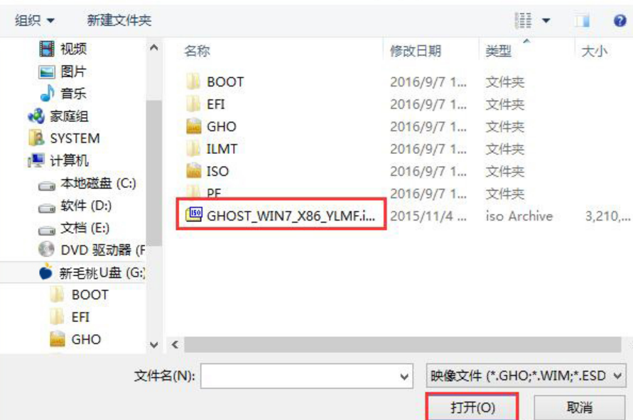 3、然后找到并選中u盤啟動盤中的win7系統iso鏡像文件,點擊“打開”。
