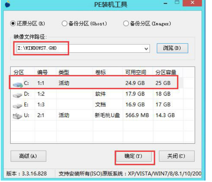 4、映像文件添加成功后,只需要在分區列表中選擇C盤作為系統盤,然后點擊“確定”就可以了。
