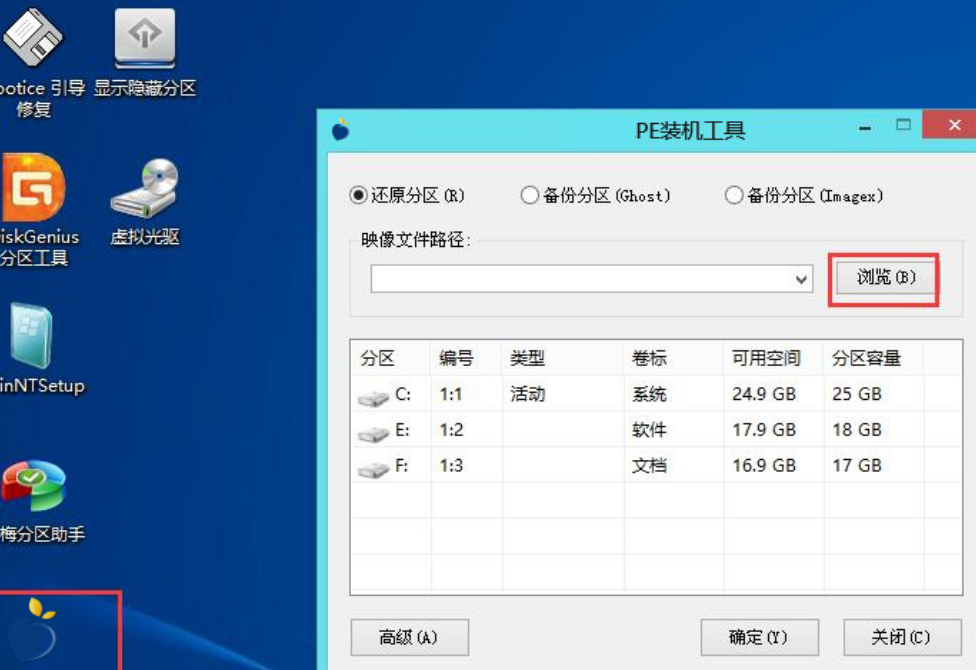 2、進入pe系統后,鼠標左鍵雙擊新毛桃PE裝機工具,打開后點擊映像文件路徑后面的“瀏覽”按鈕。