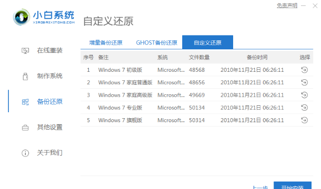 1、下載并點開小白系統軟件,點一下備份還原——自定義還原,小白會辨別出系統文件,辨別出來后點擊下一步。