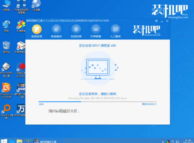 5、進入pe后,裝機吧裝機工具會自動開始安裝win7系統。
