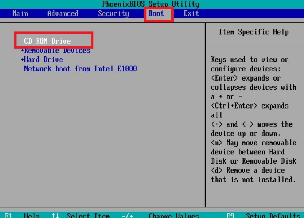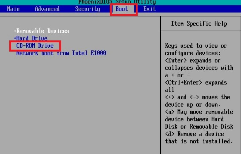3、把第一啟動項改成CDROM(有些可能是含有DVD的內容),按“+”鍵,把CD-ROM移動到第一項。