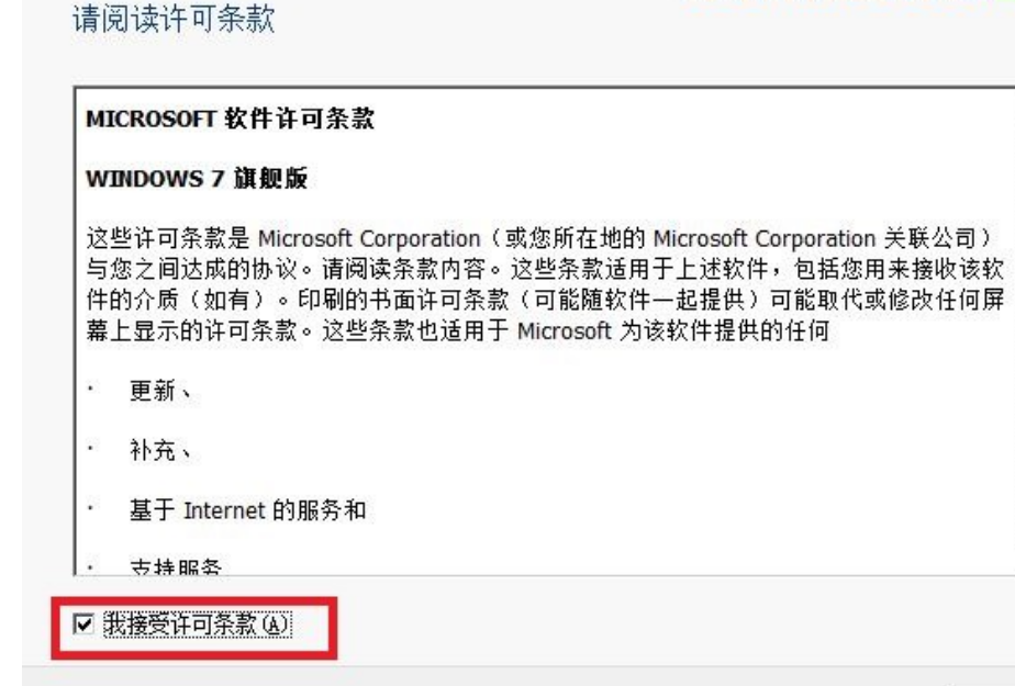 8、現在出現協議書,在“我接受許可條款”前的方框中打勾,然后點擊“下一步”。