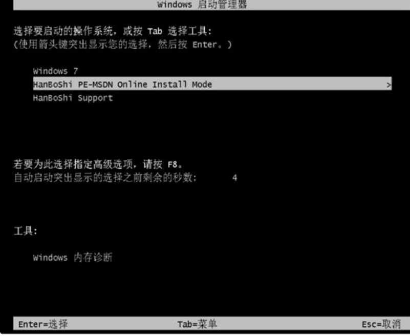 6、電腦成功重啟后進入啟動管理器界面,使用鍵盤上的上下移動鍵選擇其中的"HanBoShi PE"選項回車進入。