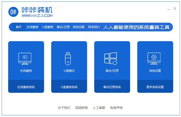 1.下載打開咔咔裝機軟件,選擇在線重裝系統;