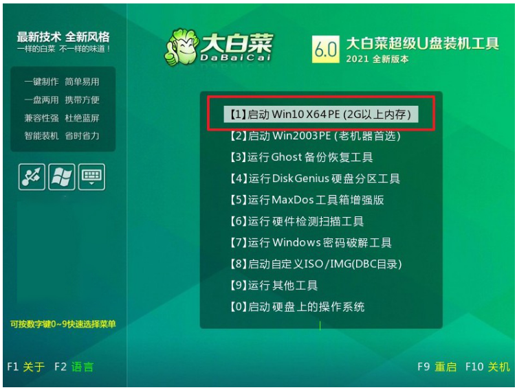 5、如下圖所示,選擇第一項,按回車進入大白菜PE桌面。