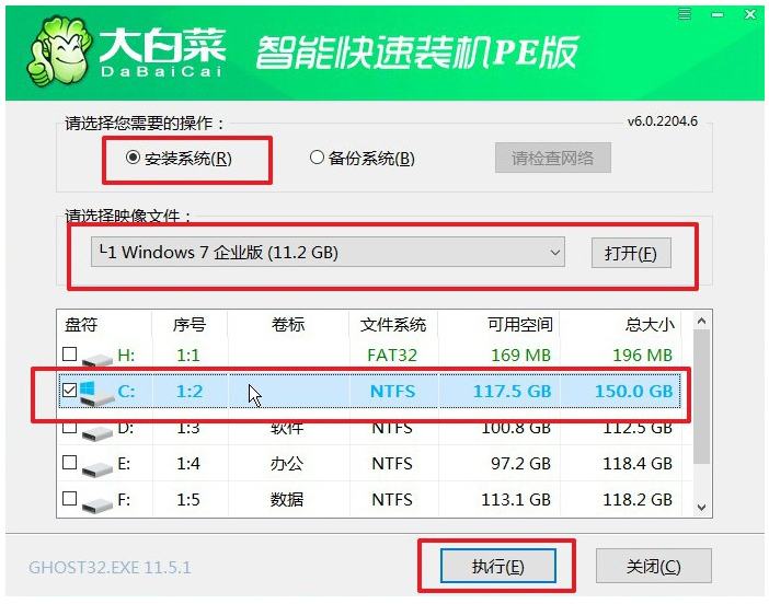 6、 雙擊打開大白菜一鍵重裝軟件,選擇win7鏡像系統作為“鏡像文件”,安裝在“C盤”中,鼠標點擊“執行”。