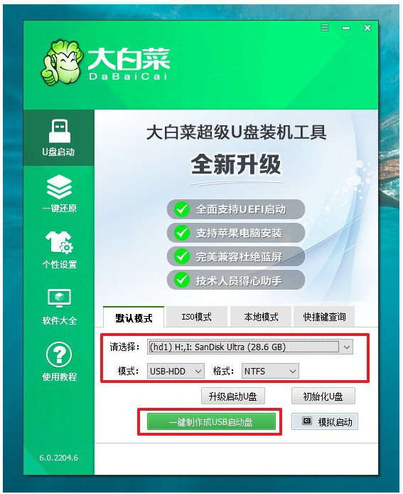 2、打開大白菜U盤啟動盤制作工具,點擊一鍵制作成U盤啟動盤即可。