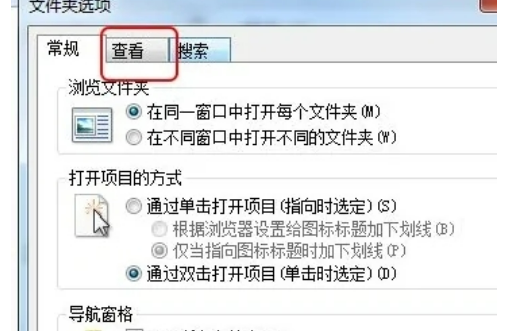 2、打開文件夾和搜索選項界面,切換至查看頁面;