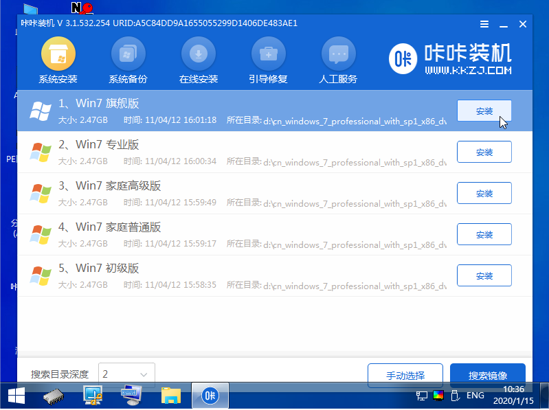 5、打開咔咔裝機工具,選擇win7系統點擊安裝系統盤c盤。