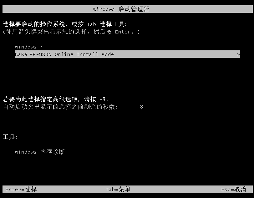 3、進入到啟動管理界面,自動選擇kaka pe-msdn項進入。