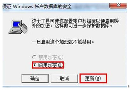 2、此時將會打開“保證windows賬戶數據庫的安全”窗口界面,勾選“啟用加密”,點擊“更新”;