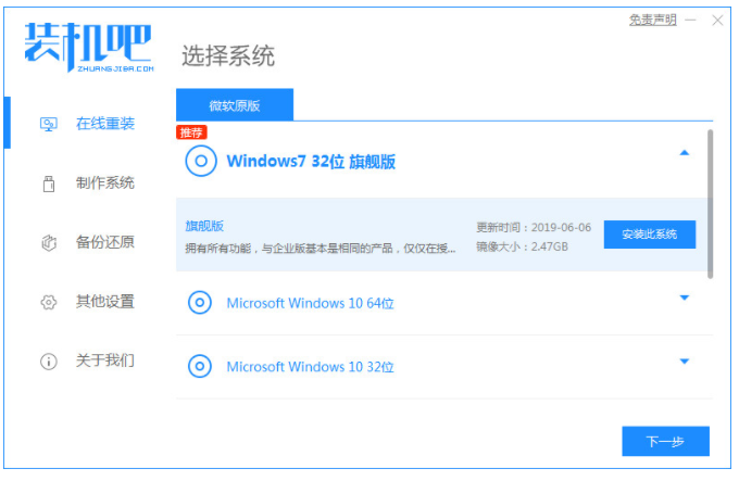 1、下載安裝裝機吧一鍵重裝系統到電腦上,雙擊打開,點擊在線重裝,選擇我們需要win7系統版本進行下載。