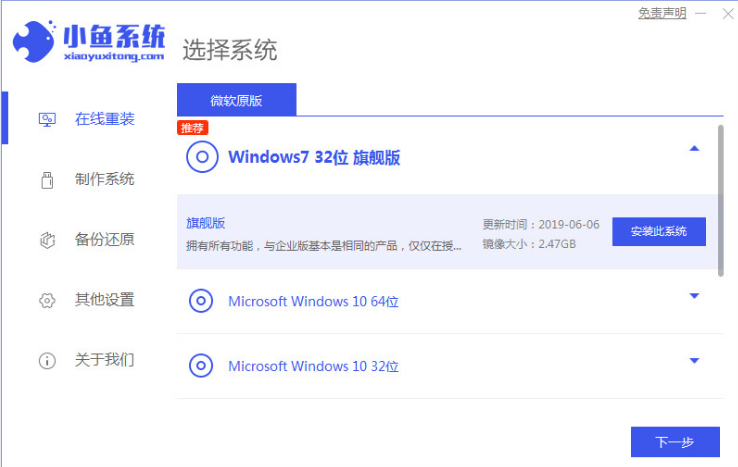 1、下載安裝小魚一鍵重裝系統工具,雙擊打開,選擇需要安裝的的win7系統,點擊安裝此系統,點擊下一步。