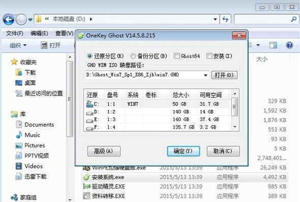 雙擊【安裝系統.exe】,打開安裝工具onekey ghost,選擇“還原分區”,加載映像路徑win7.gho,選擇安裝位置如C盤,點擊確定。