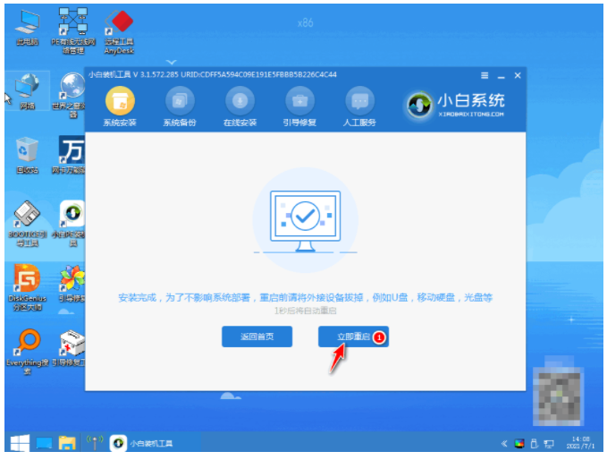 4、當我們的電腦進入pe系統內,繼續安裝系統,安裝完成之后,再次點擊立即重啟電腦。