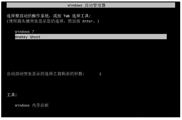 5、電腦重啟之后,啟動菜單界面多出Onekey Ghost選項,電腦此時會自動選擇這個選項進入;
