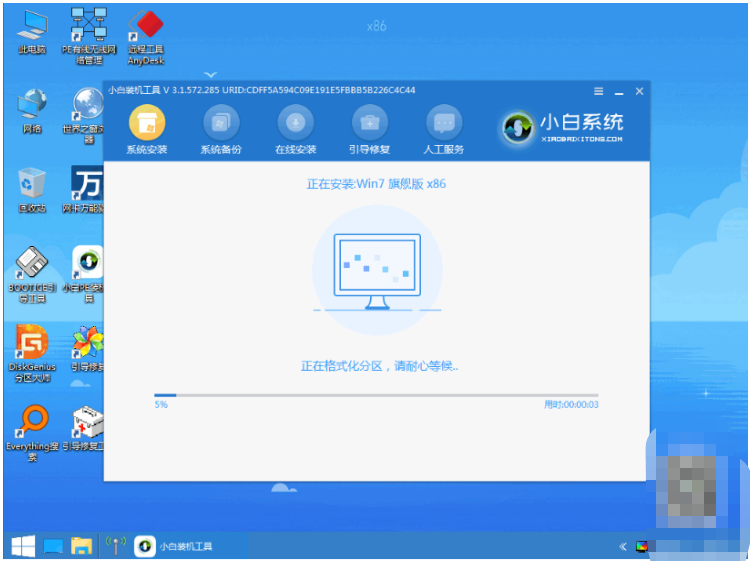 6、進入pe系統之后,小白裝機工具這時將會自動安裝win7原版系統。