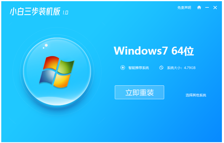 1、先在網上搜索并下載安裝小白三步裝機版工具并打開,選擇需要安裝的win7系統,點擊立即重裝。