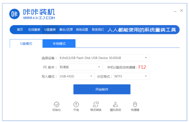 1、win7用不了怎么重裝系統呢?首先在可用的電腦上下載安裝咔咔一鍵重裝系統工具,并點擊打開,插入空白u盤到電腦,選擇制作系統模式,點擊開始制作啟動盤。