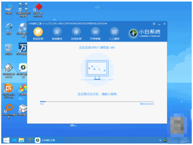 6、當我們的電腦進入pe系統后,裝機工具將會自動開始安裝win7系統。
