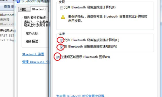 在連接下邊,把三個選項都打鉤:【準許Bluetooth機器設備連接到此計算機】、【新Bluetooth機器設備要連接時告知我】、【在通告區域顯示Bluetooth圖標】。