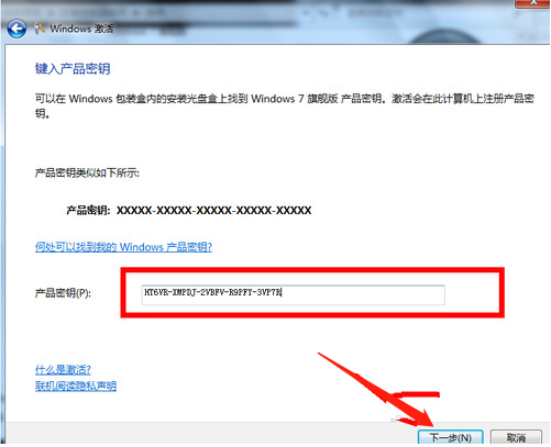 3.接下來,輸入windows7系統旗艦版64位系統密鑰,輸入完成,點擊下一步;