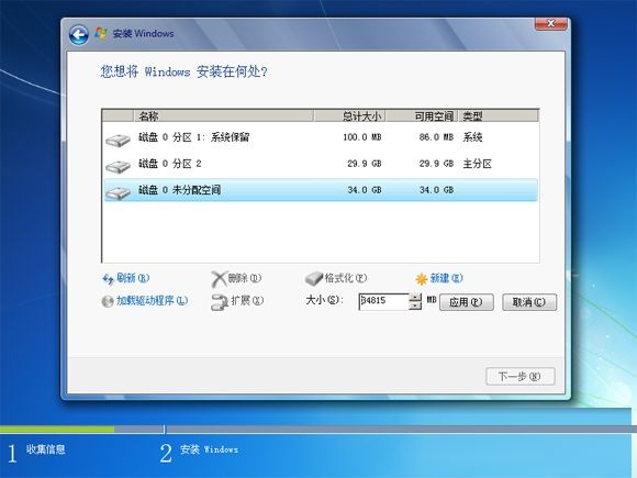 7、選擇未分配的空間,點擊新建,直接應用,就完成了分區,也就是4k對齊操作,之后選擇要安裝系統的分區,比如這邊的分區2,下一步;