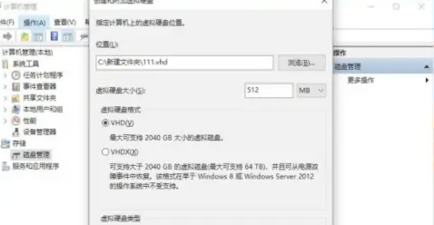 2、在計算機管理窗口中,先點擊存儲下的磁盤管理,再點擊頂部工具欄操作,在打開的下拉菜單項中,選擇創建 VHD。