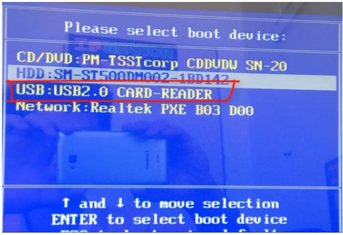 4.將u盤插入需要重新需要安裝的電腦中,將電腦重啟或開機啟動并快速斷續地按下熱鍵,進入快速啟動菜單界面。