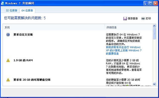 3、等待幾分鐘之后,檢查完成后會顯示結果,檢測報告包括能否裝32位和64位系統的檢查結果,其中黃色三角圖標表示不符合或存在不兼容的選項,所有條件都符合才能裝win7系統,有問題的選項需要解決,解決不了就不能裝win7。