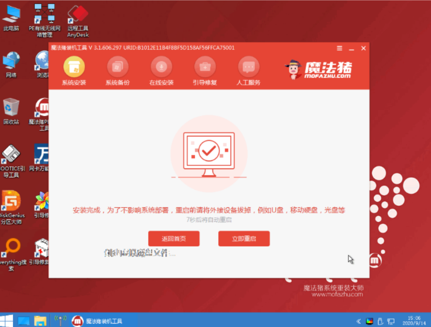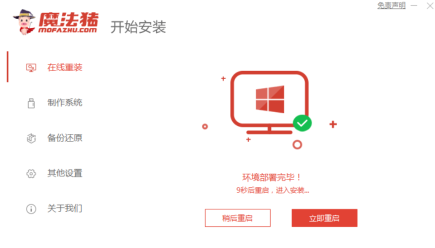 3、安裝工具現在將部署并安裝下載的系統。環境部署完成后,單擊立即重啟。
