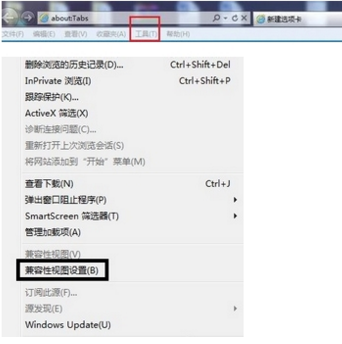 2、點擊“工具”選項,會跳出一個下拉菜單,選擇“兼容性視圖設置”選項。